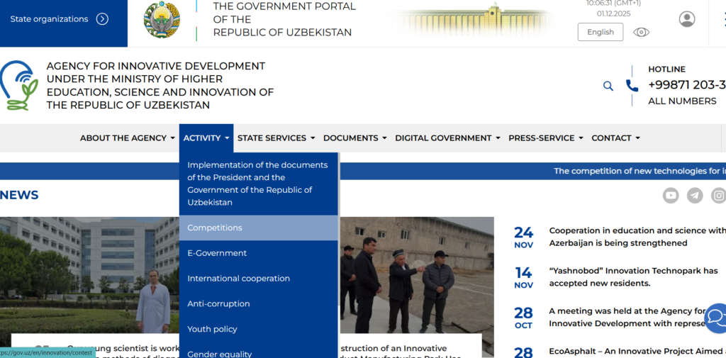 -Ministry of Innovative Development of the Republic of Uzbekistan / Agency for Innovative Development: for the competition / grant program https://gov.uz/ru
