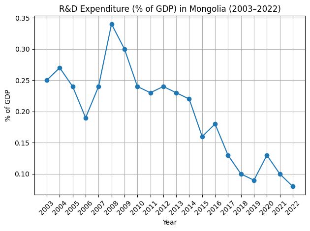 In 2022, Mongolia’s spending on R&D (research and development) amounted to 0.08% of GDP.In 2021, it was 0.10% of GDP.R&D expenditure (as a percentage of GDP) has been declining for two consecutive years.Since monitoring began in 1997, this indicator has decreased by a factor of 2.01.The highest level of R&D expenditure in Mongolia was recorded in 2008 at 0.34% of GDP.The lowest value was observed in 2022, when it dropped to 0.08% of GDP.https://statbase.ru/data)(figure 17)